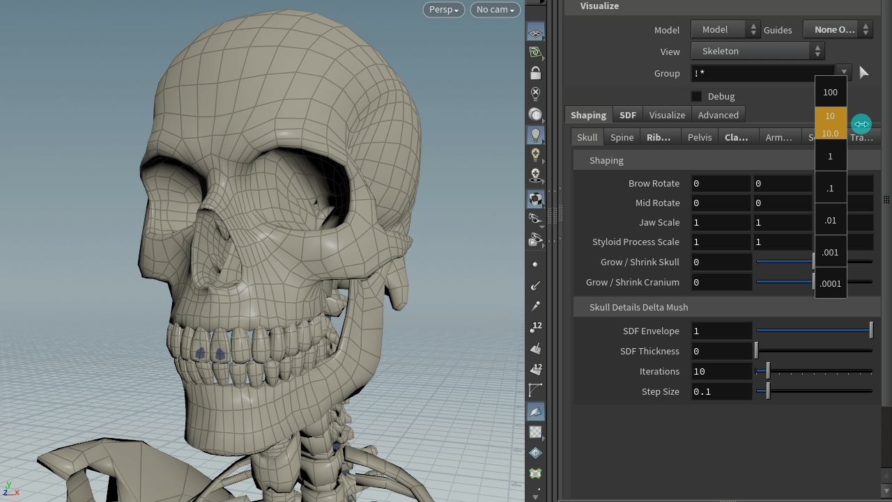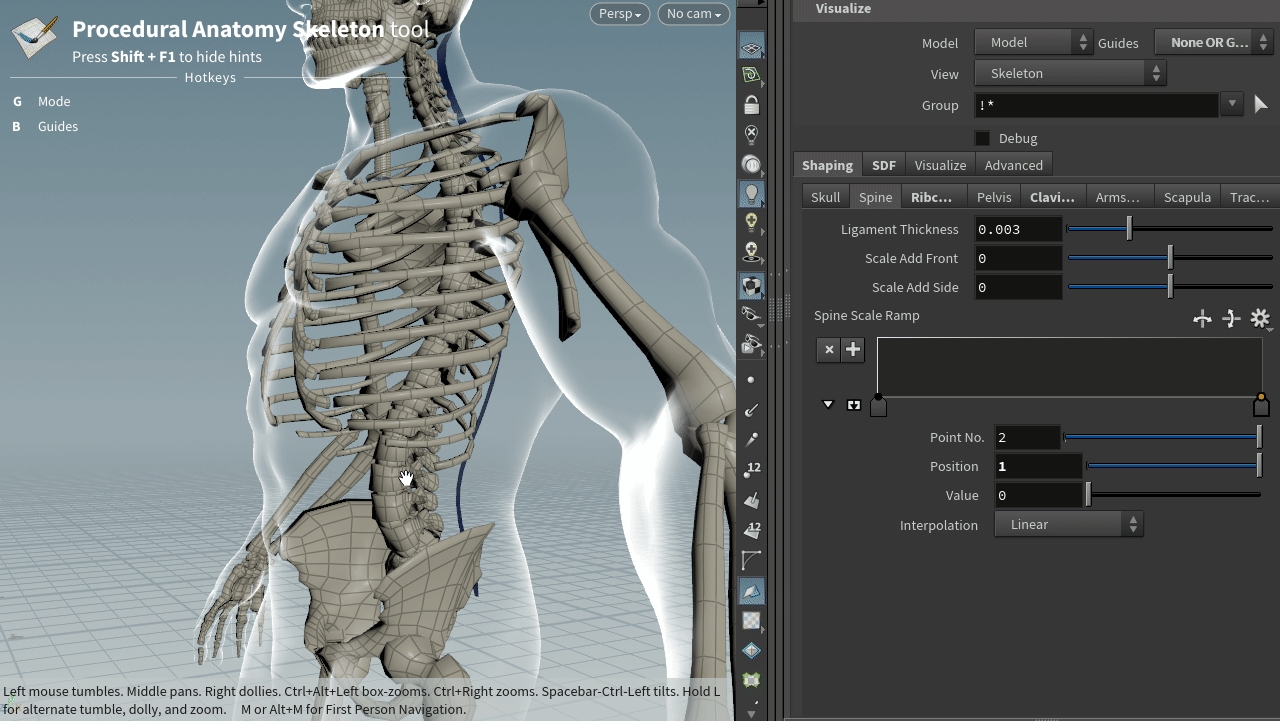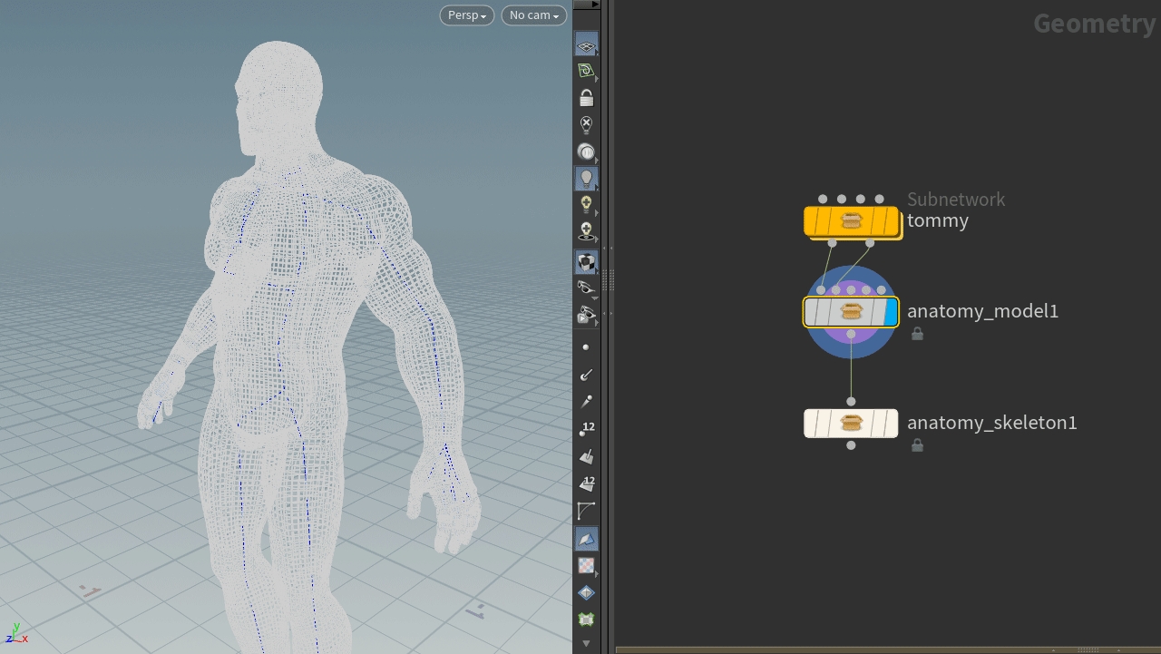 A quality of life workflow is visualizing the Skeleton node (with the blue mark on node) while selecting the Model node. This enables you to modify the skeleton while visualizing the skeleton model. Procedural Anatomy has been designed to work like this so you can see what your edits are live.
